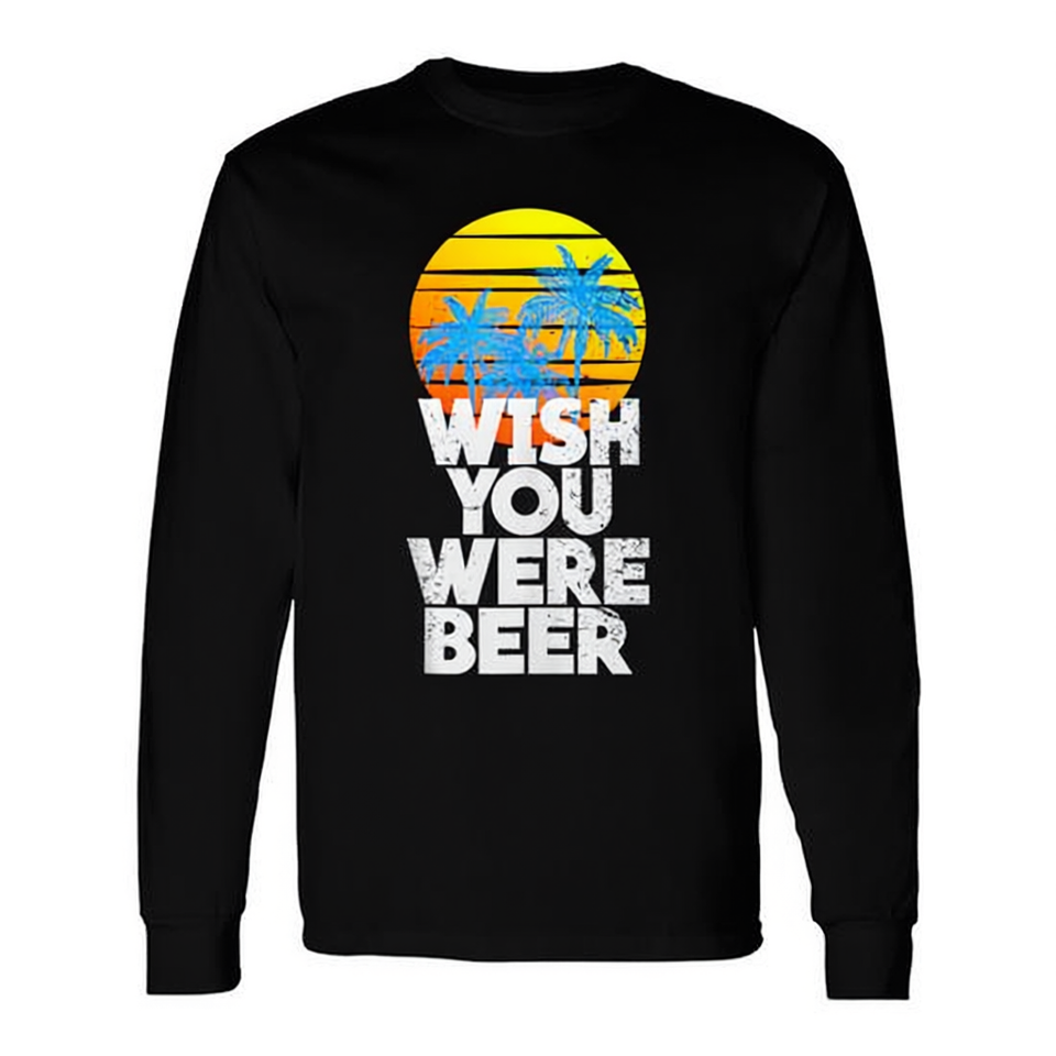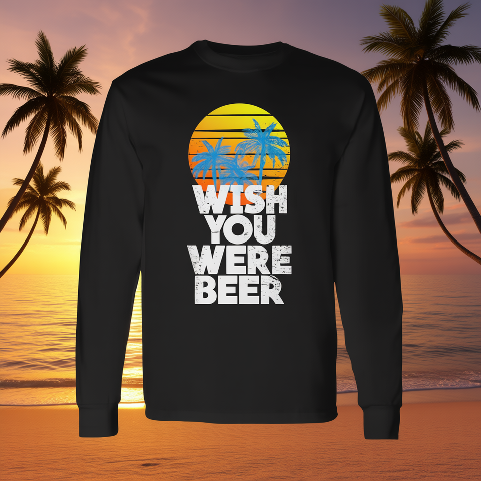 T-shirt a maniche lunghe con design 'Wish You Were Beer' e palme al tramonto sulla spiaggia