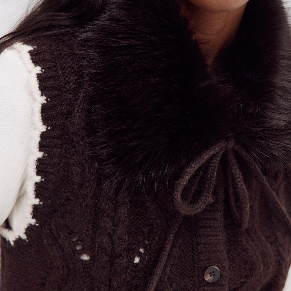 Wisrise Fashionable Casual Looks Custom Wholesale Women's Dark Brown Faux Fur Collar Chunky Cable Knit Vest