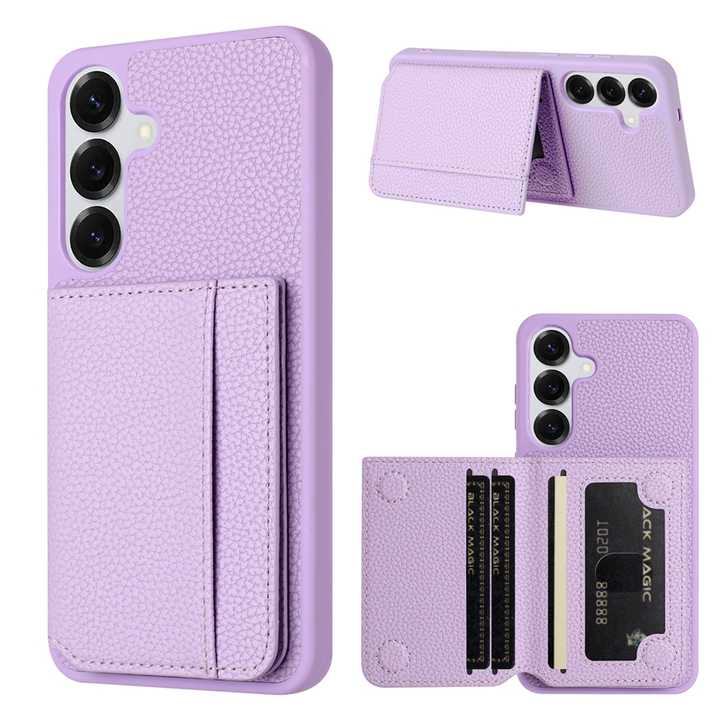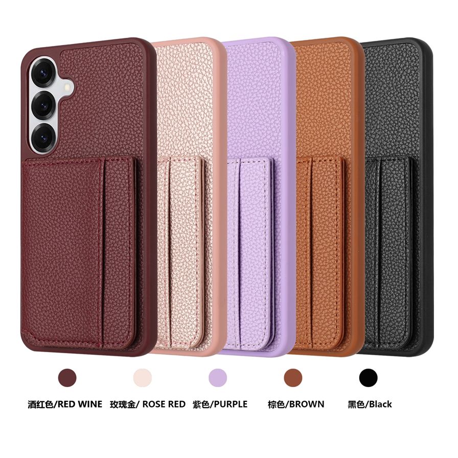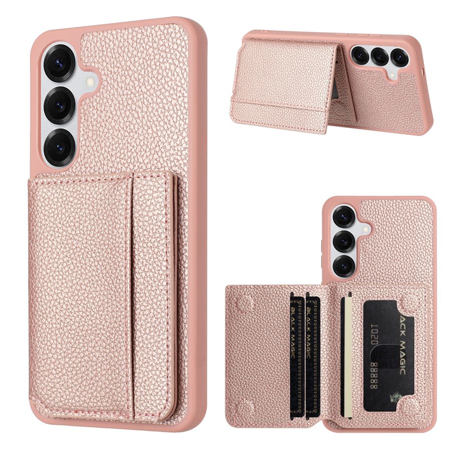 Custodia in Pelle Litchi con Slot per Carte e Supporto Magnetico per Samsung Galaxy S25 Edge Plus S24 Ultra S23 FE S22 S21, Cover Posteriore in Silicone