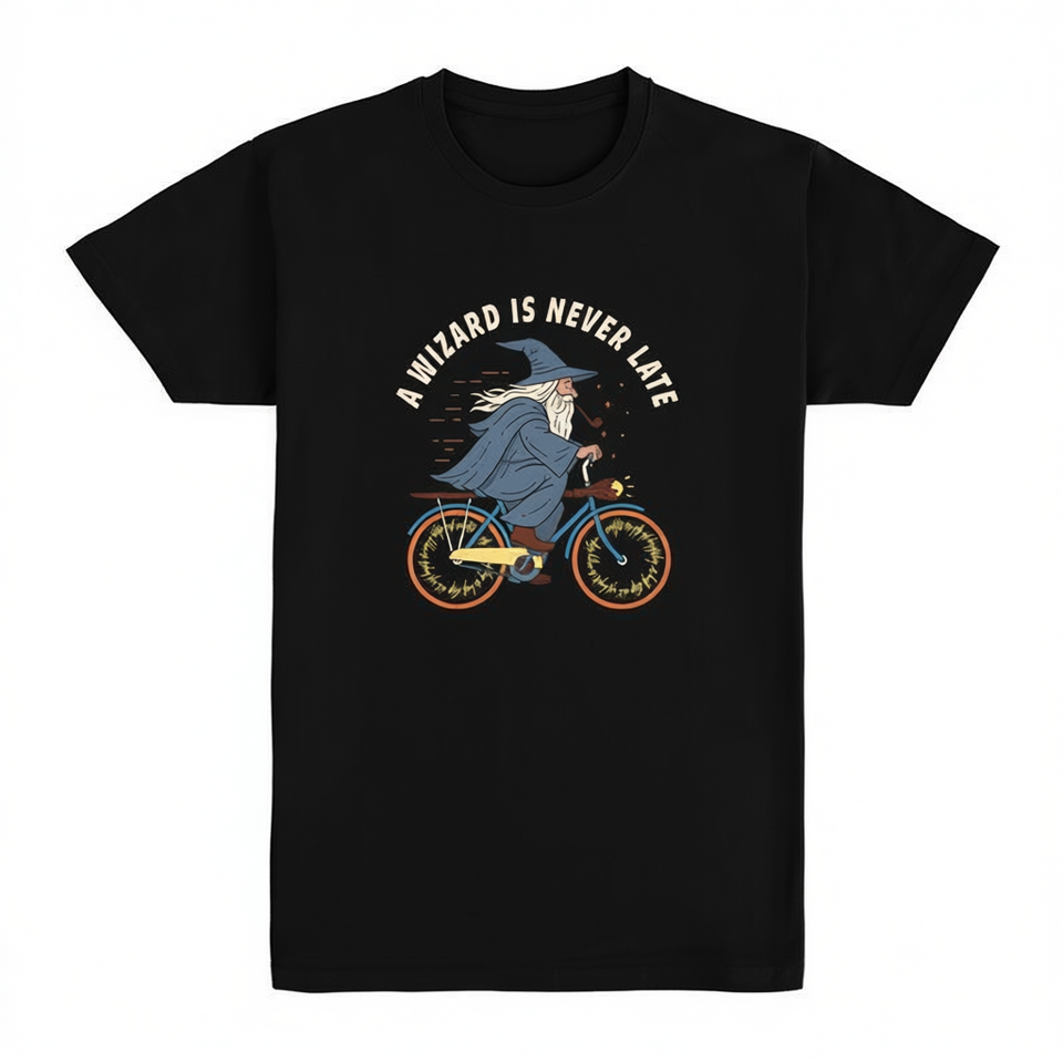 T-shirt Wizard Bike nera unisex per adulti taglia media con stampa grafica dal design fantasy