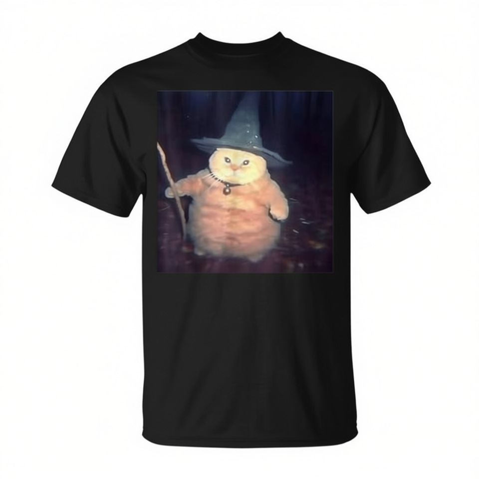 T-Shirt Unisex con Stampa Digitale 'Wizard Cat Halloween Meme', Taglia Media, Collo Rotondo, Manica Corta, Promozionale