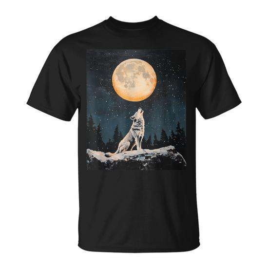 T-shirt grafica Wolf Moon Starry Night da uomo a maniche corte nera