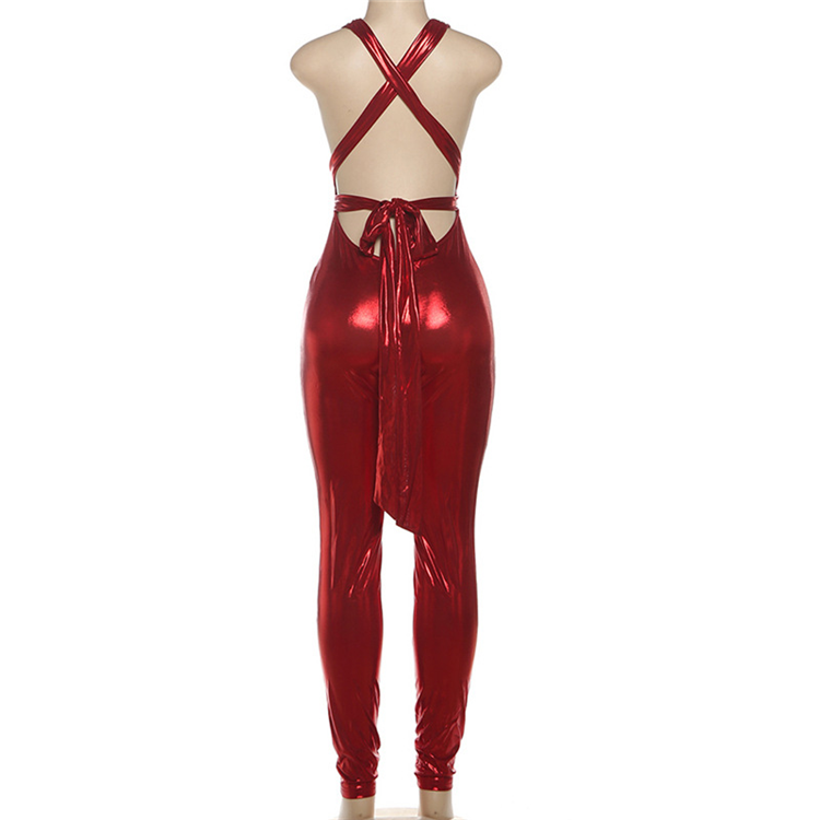 Woman Sexy Soild Shiny Hollow Jumpsuit Midnight Backless Lace up Overalls