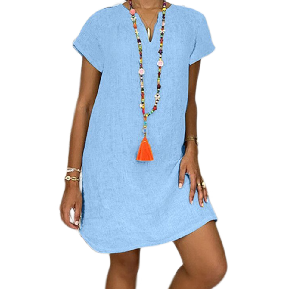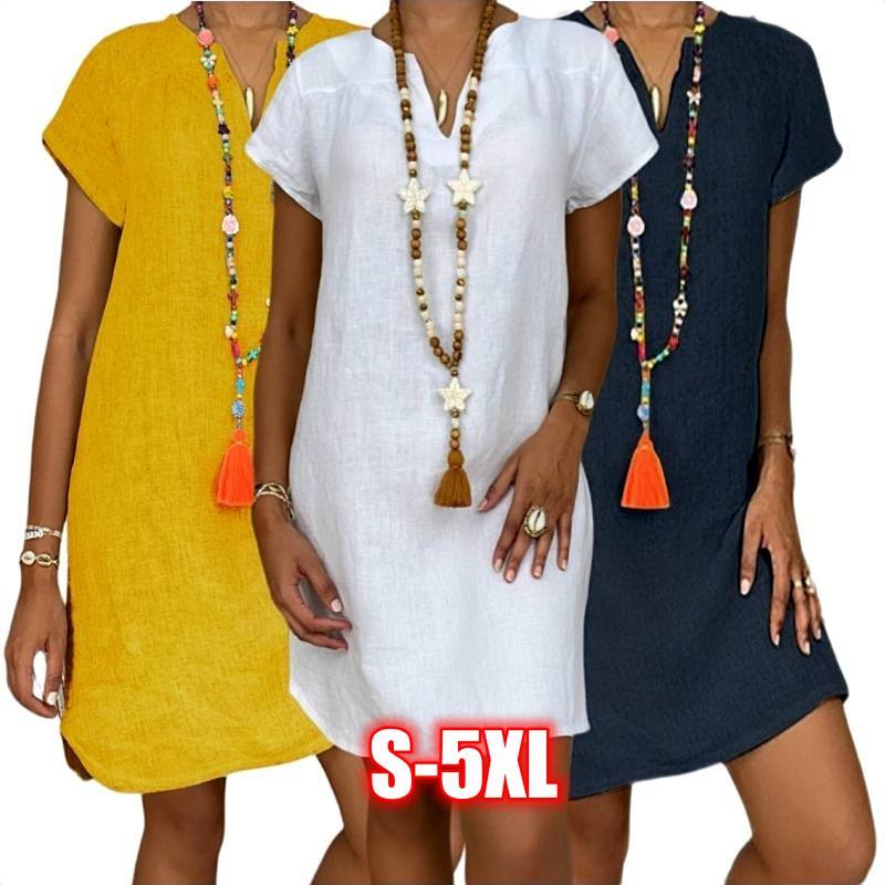Women Cotton Linen Solid Dresses Summer Casual Loose Short Sleeves V-Neck Mini Dress Vintage Female Beach Dresses Plus Size