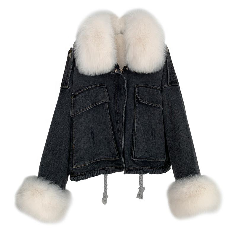 Donne giacca di jeans di stile di inverno della pelliccia di fox trim cappotto del coniglio del rex foderato di pelliccia del cappotto della signora