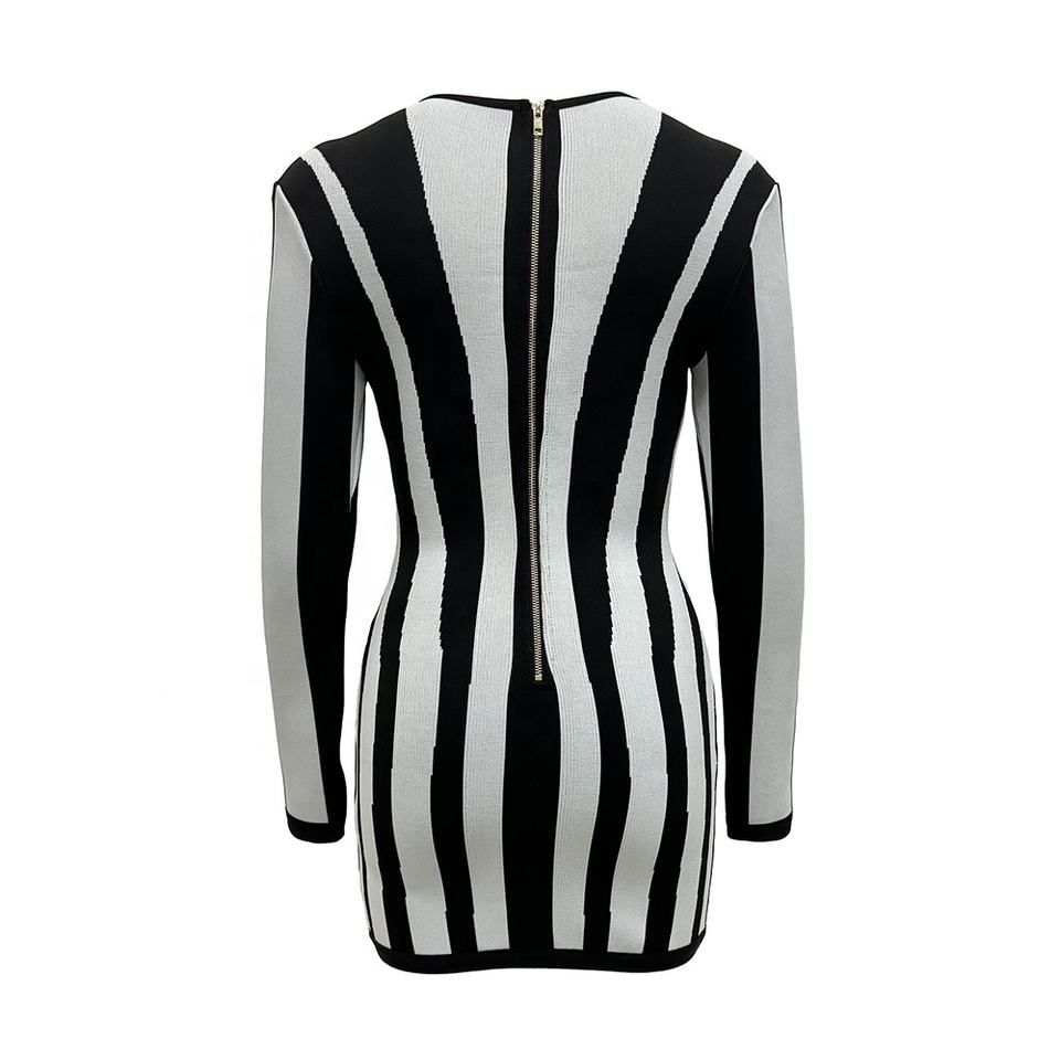 Women Elegant Black White Striped Bandage Dress Women Knitted Long Sleeve Celebrity Party Mini Dresses