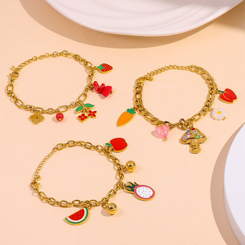 Braccialetto da donna in acciaio inossidabile smaltato con ciondolo in oro 18k a forma di frutta: fragola, anguria, fiore e campanella. Gioiello carino regolabile.