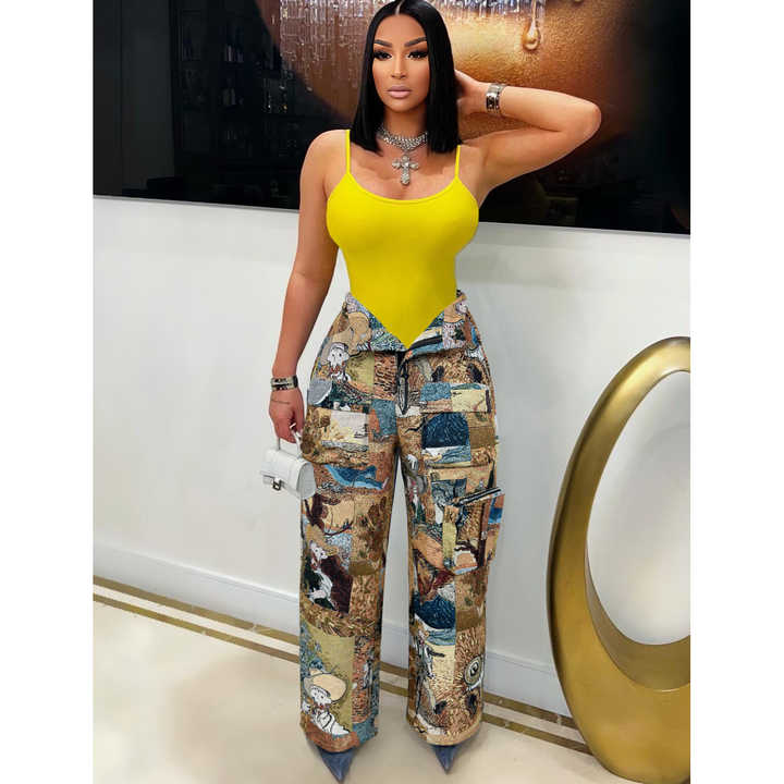 Women Fashion Jacquard Retro Multi Pockets Cargo Pants Button Fly High Waist Loose Casual Streetwear Straight Trousers
