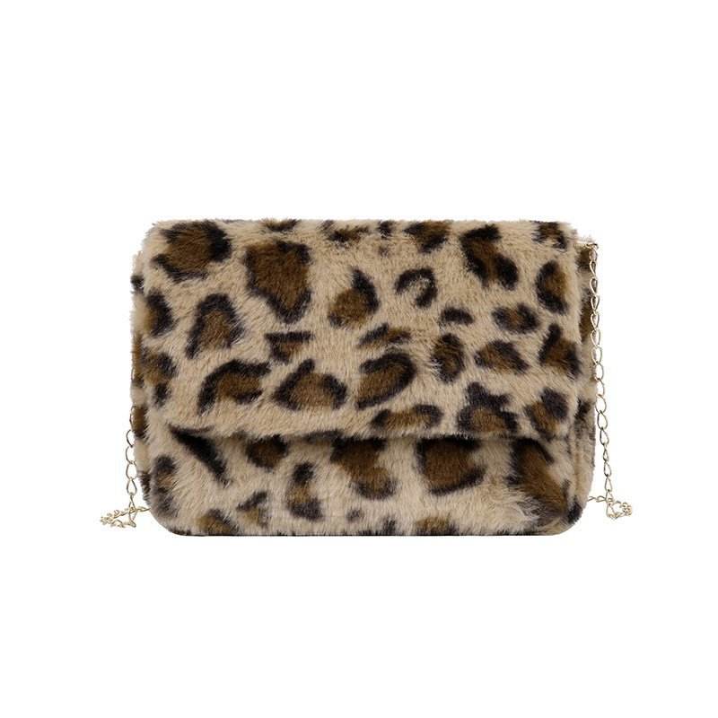 Women Fashion Leopard Print Shoulder Bag Fluffy Plush Handbag Cow Print Cross-body Purse Faux Fur with Chain Strap