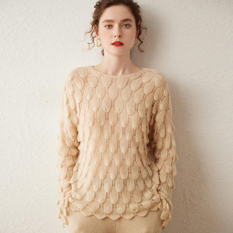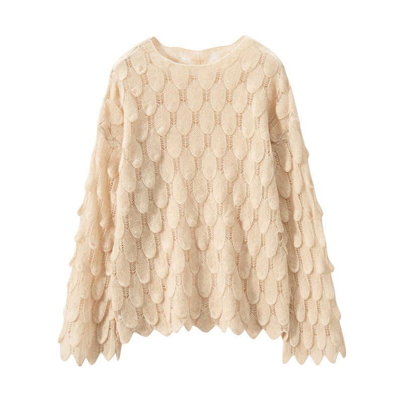 Women Fashion New Luxury Hollow Cozy Soft Feather Shape Cashmere Pullover Sweater