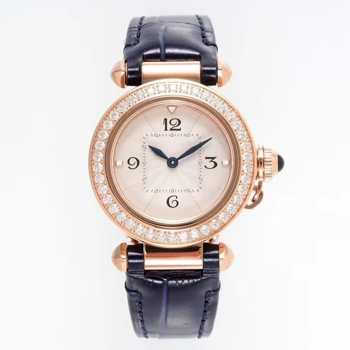 Women Gold Business Watch Roman Numeral Sapphire Crystal Dial Pointer Diamond Accent Leather Bracelet Luxury Cartieres