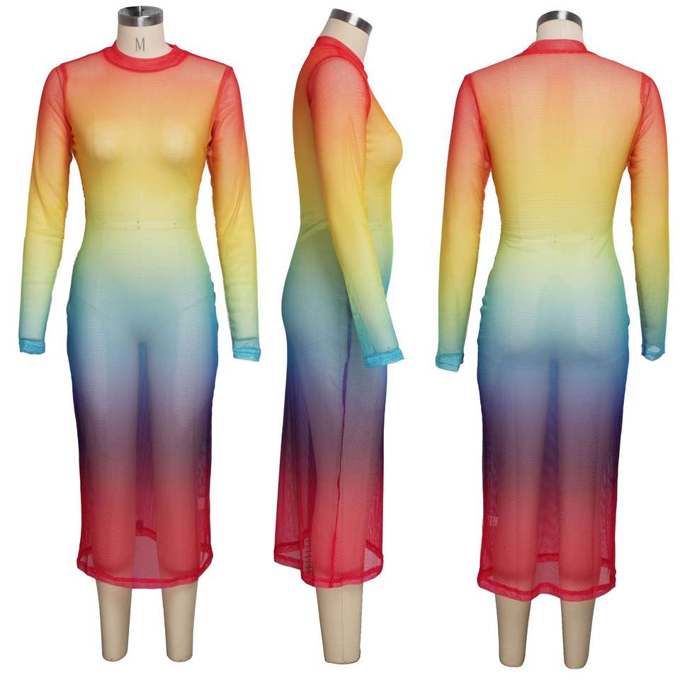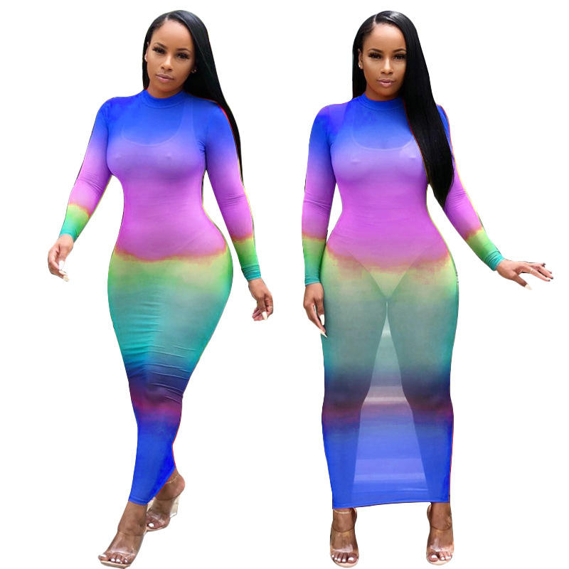 Women Graduation Gauze Mesh See Through O-neck Long Sleeve Maxi Dress Sexy Beach Club Night Women's Midi Dresses