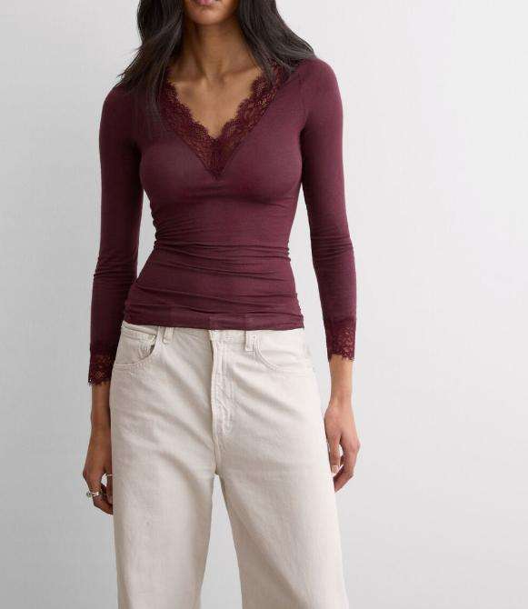 Camicetta da donna casual in pizzo con scollo a V, maniche lunghe, bordeaux, aderente, arricciata, slim fit