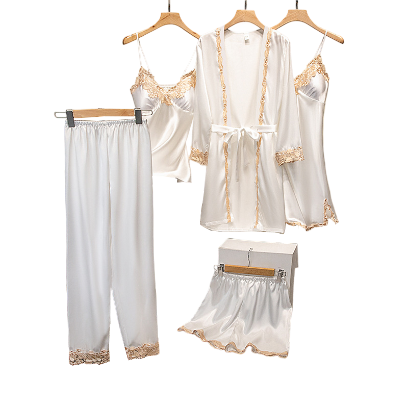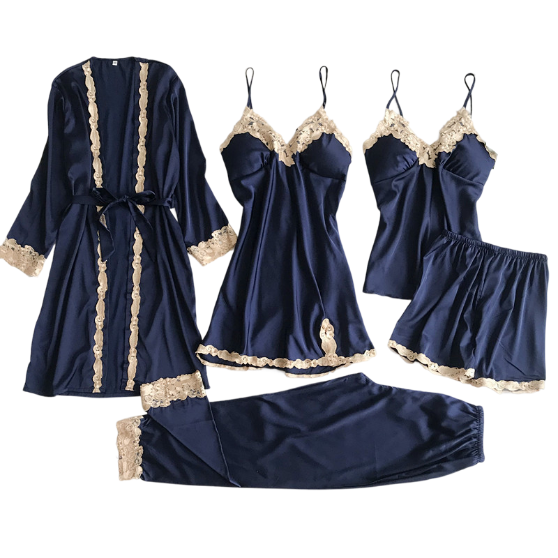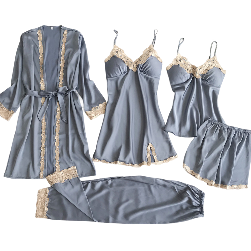 Women Lady Sexy Robes Pajamas 5pcs Sets Bathrobe Bridesmaid Gift Long Lace Pajamas Tie Casual Nightgown Home Clothes
