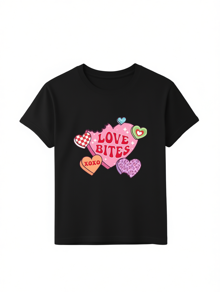 Women Love Bites Heart Pattern Printed Round Neck T-Shirt Short Sleeve Loose Casual Valentine's Day Theme 100% Pure Jersey