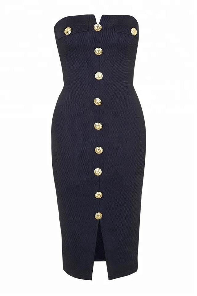 Abito Aderente Midi Blu Navy Senza Spalline con Bottoni per Donna