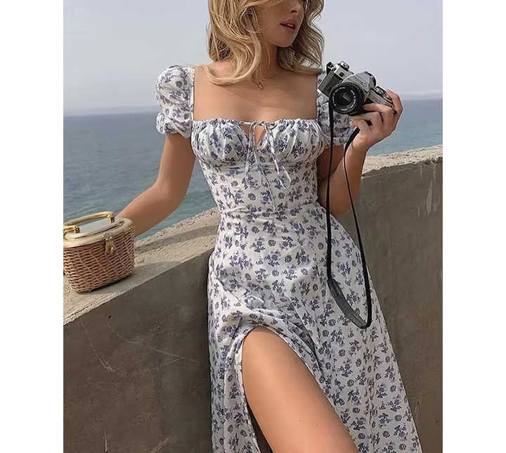 Women New Arrival Dress Puff Sleeve Floral Print Slit Long Dresses Summer Fashion White Elegant Ladies Backless Clothes
