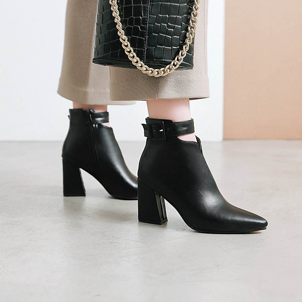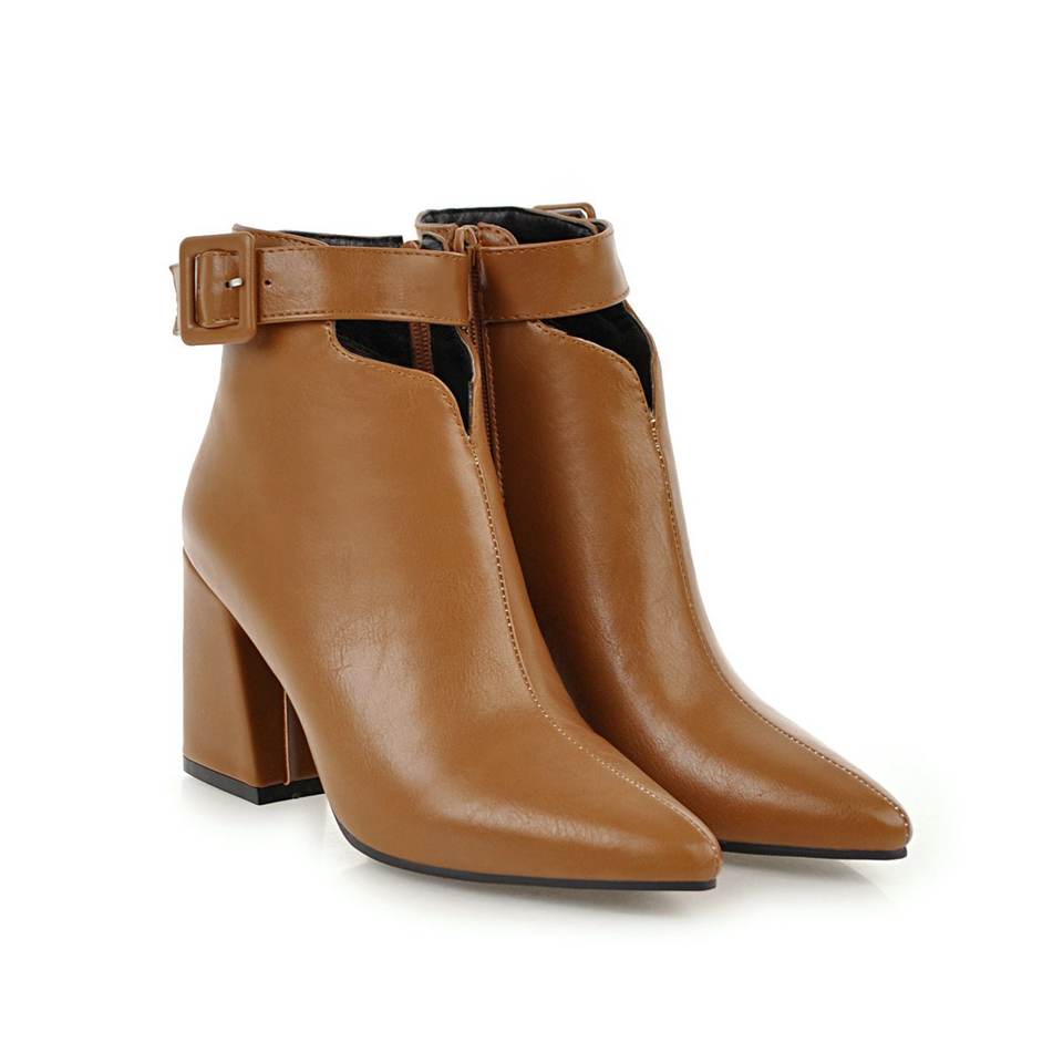 Women New Short Boots Brown High Heels Women Boots Pointed Belt Buckle Roman Style Winter Ankle Boots Thick Heel Ladies