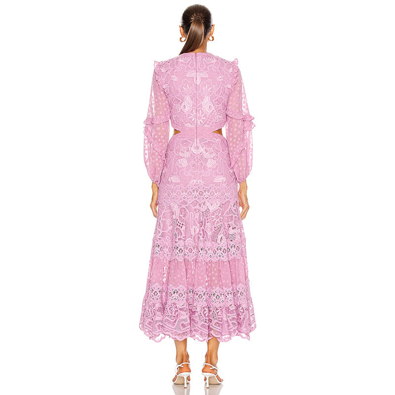 Abito lungo da donna elegante a vita alta con scollo a vita alta a maniche lunghe in pizzo rosa arricciato a maniche lunghe