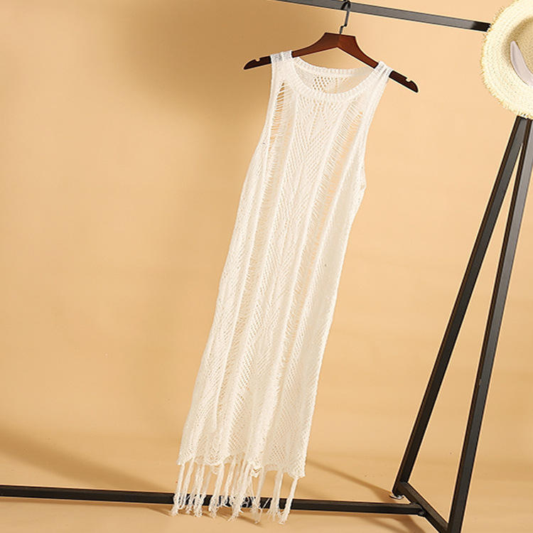 Women New Swimsuit Cover up Sexy Women Beachwear Tank Dresses Long Beach Tunic Crochet Hollow Out Tassel Bathing Coverup Dress