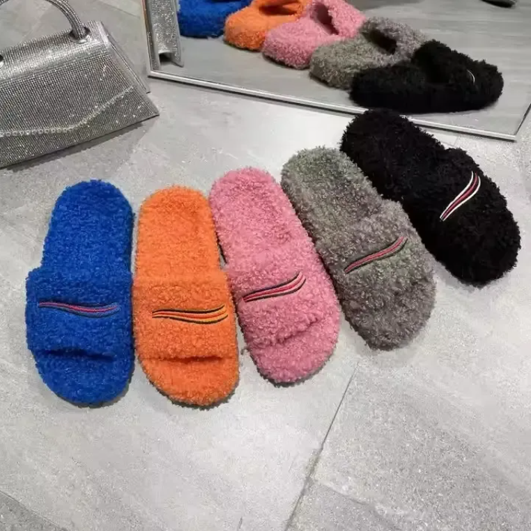 Women Platform Slippers Furry Slide with Embroidery Warm Heels Sandals for Women