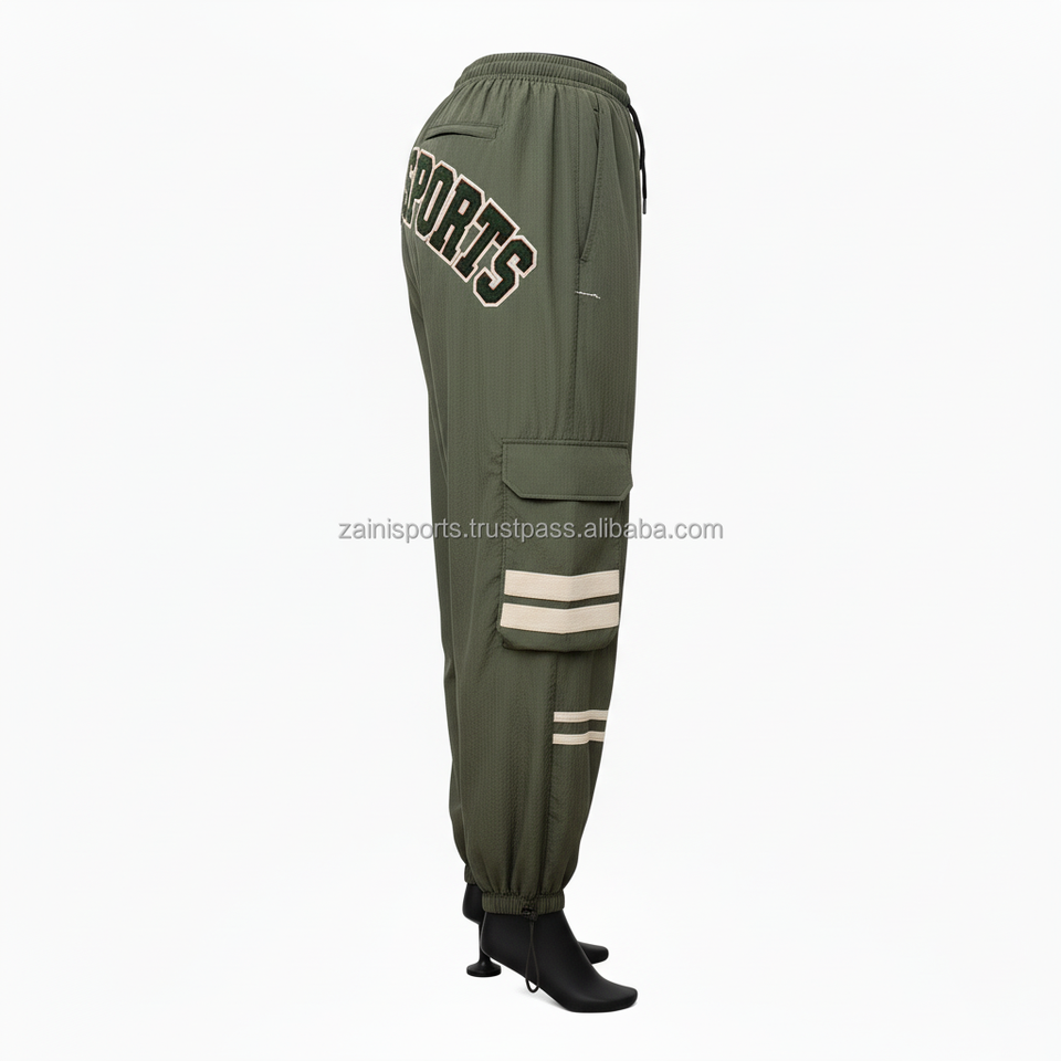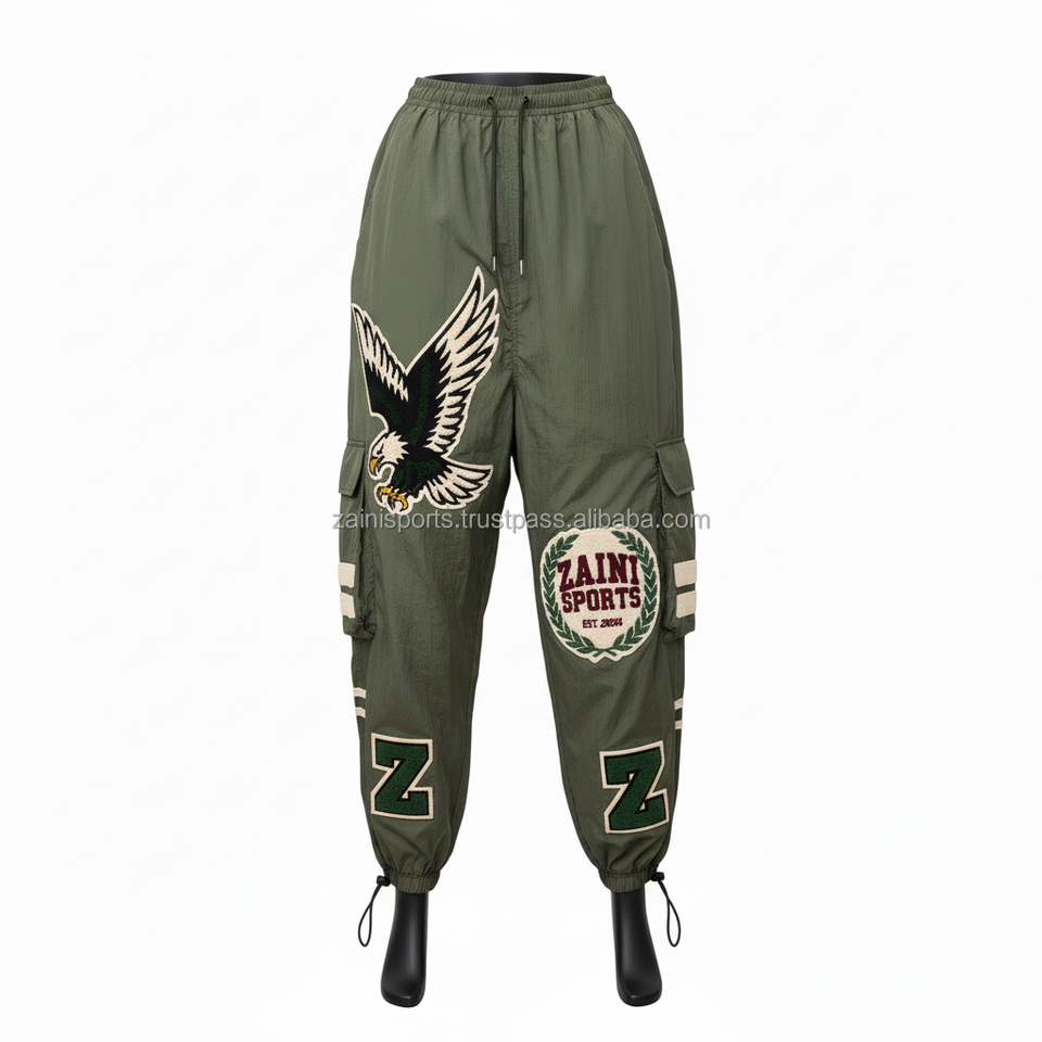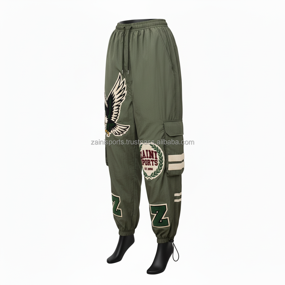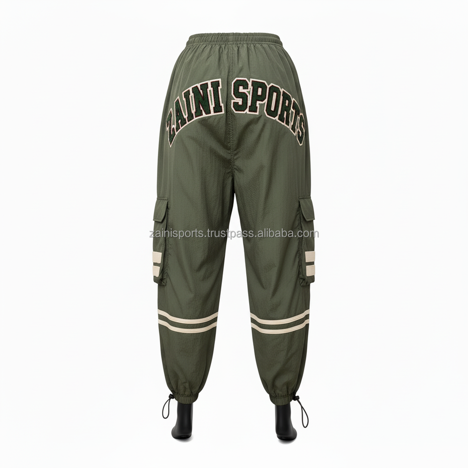 Women Premium Windbreaker Pant 130 GSM Nylon Fabric Olive Green Cargo Style With Chenille Patch Custom Logo Windbreaker Pants