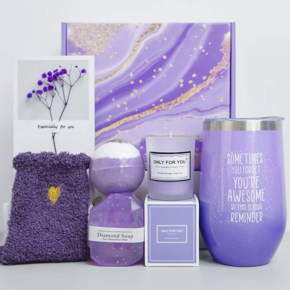 Women Purple Lavender Relaxing Spa Get Well Soon Gift Set Bath Bomb Soap Tumbler Flower Card Valentine's Women Gift Sets
