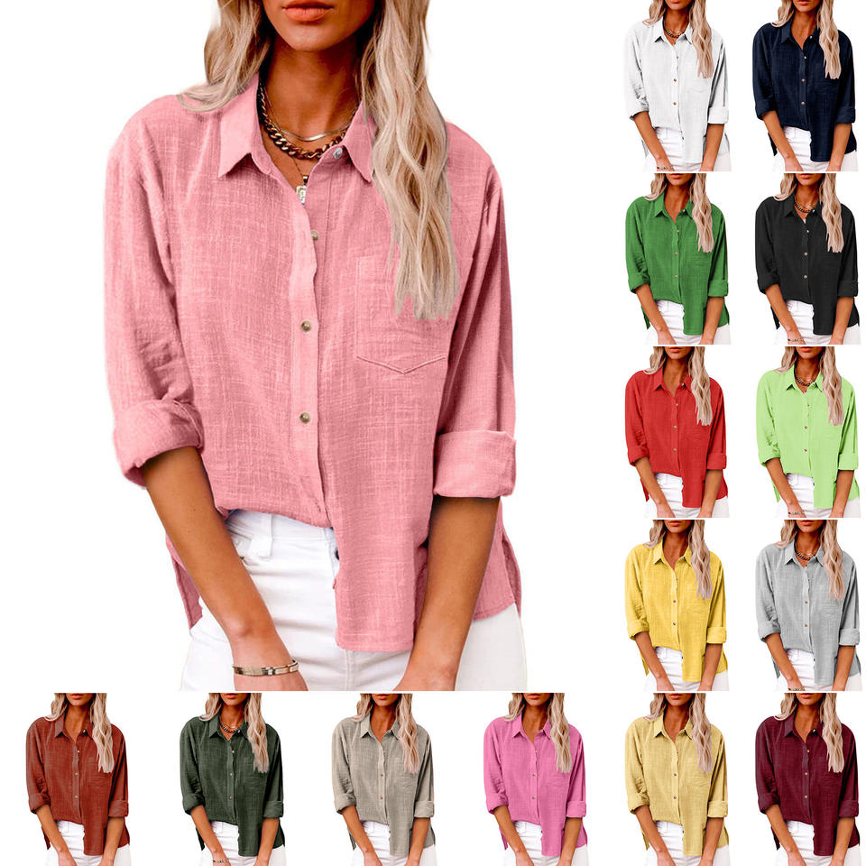 Camicia da donna a maniche lunghe con vestibilità rilassata, abbottonatura frontale, tinta unita, per uso quotidiano