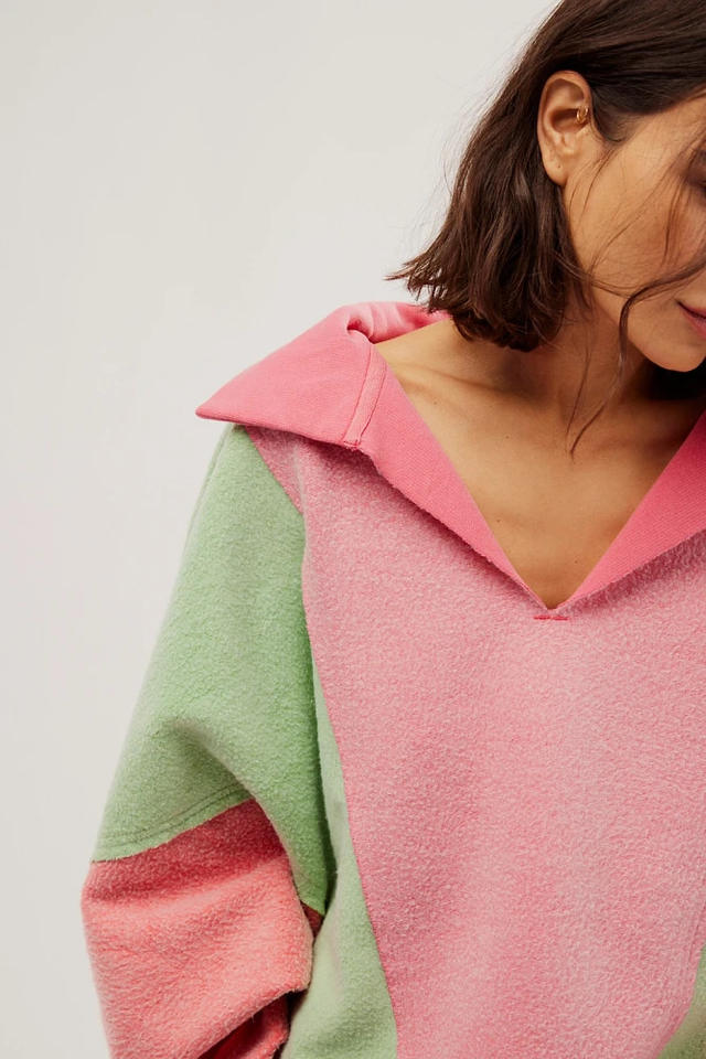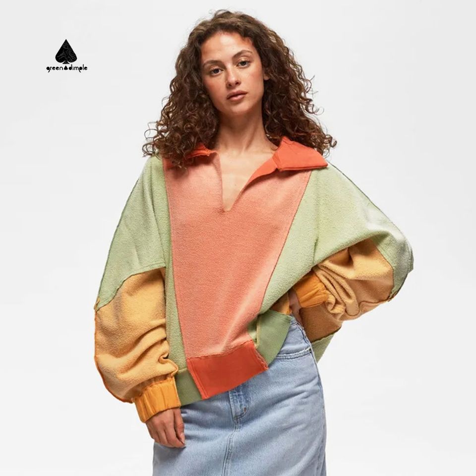 Felpa da donna con collo a collo alto in pile retrò Color Patchwork manica lunga a sbuffo felpa ampia per camicetta Casual