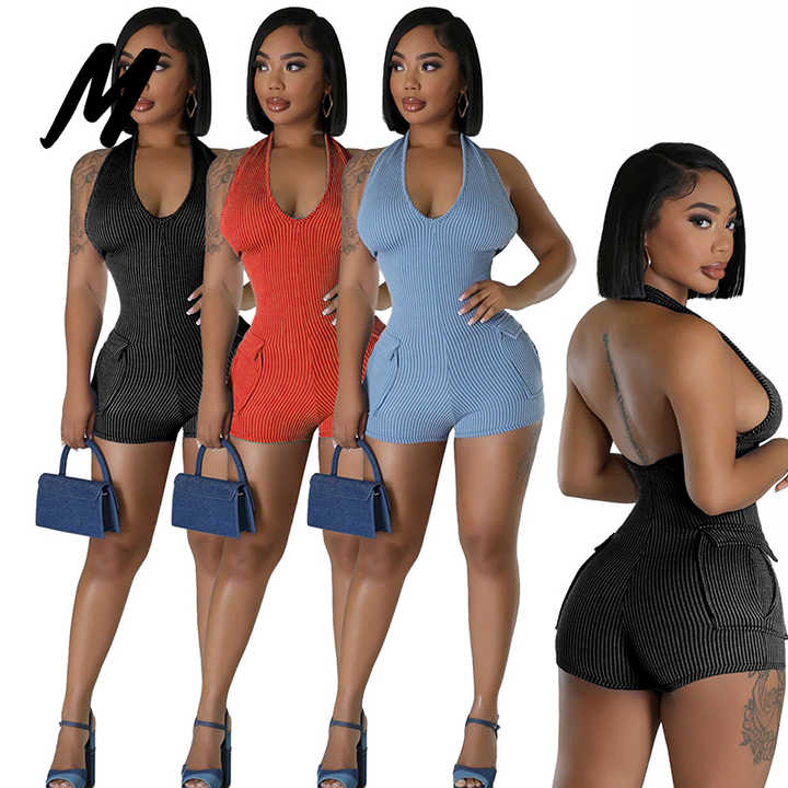 Da donna Chic Super elastico con cavezza a schiena scoperta con tasca 3D tuta Slim Fit tuta un pezzo 2024 abbigliamento estivo donna