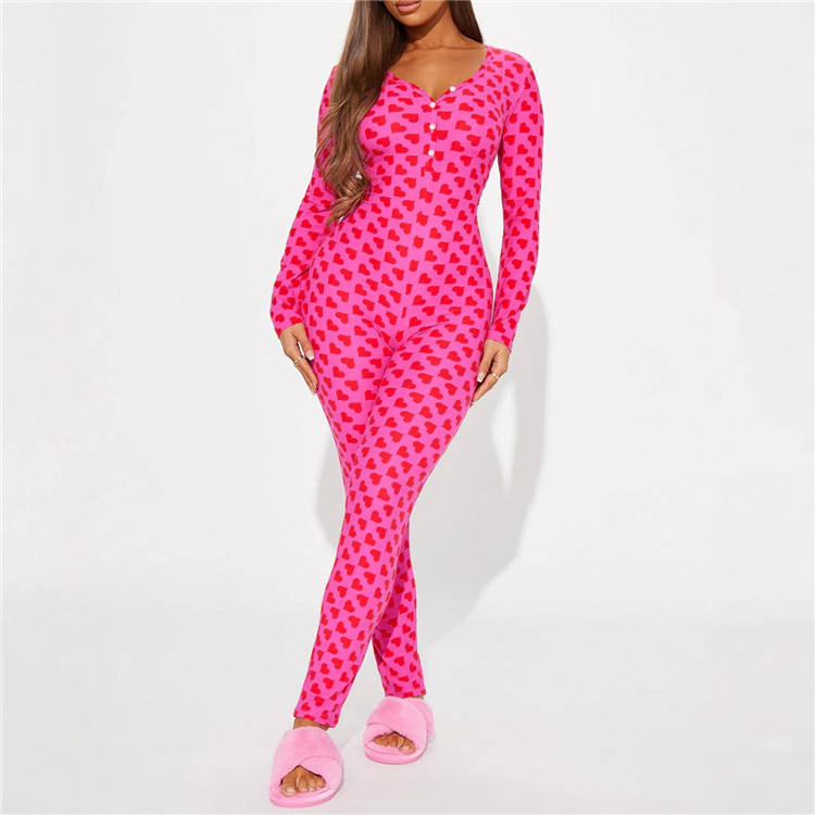 Tuta Intera Sexy da Donna con Scollo a V Profondo, Stampa a Cuori, Maniche Lunghe e Dettaglio Posteriore, Pigiama per San Valentino