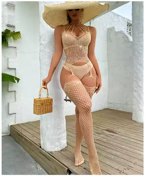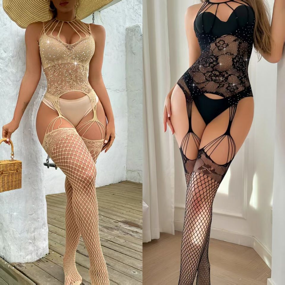 Women Sexy Lingerie Costume Erotic Nightwear Body Stocking Halter Rhinestone Hollow Out Fishnet Nude Bodystockings Tz692