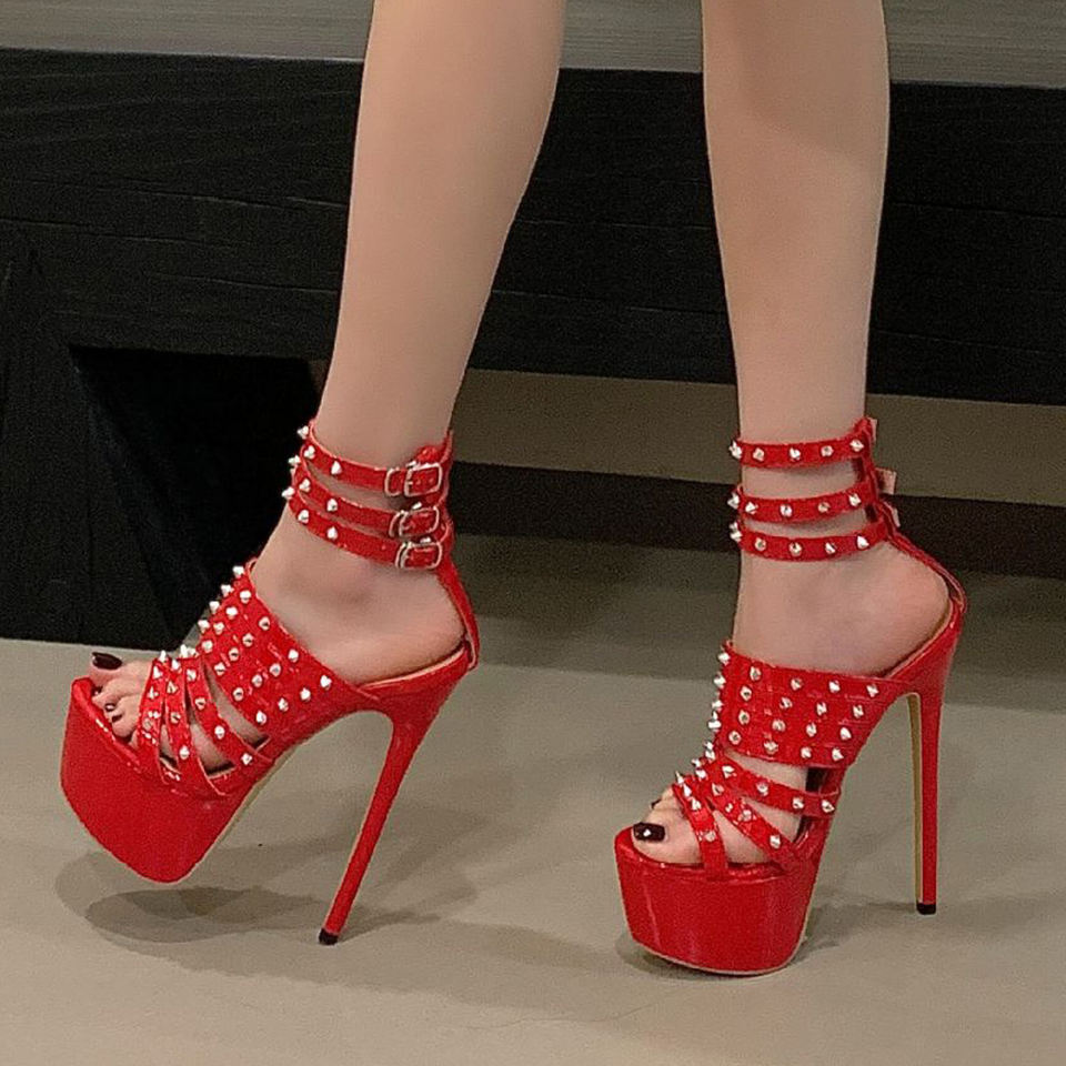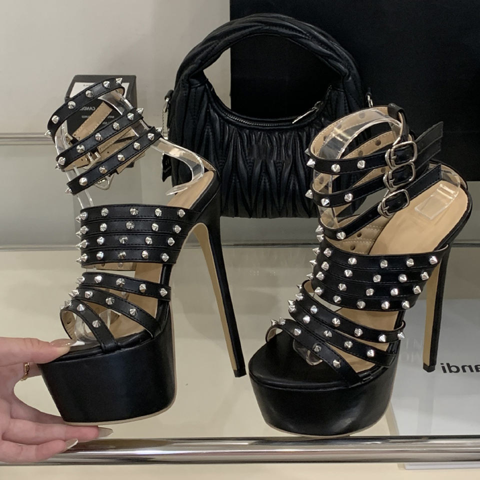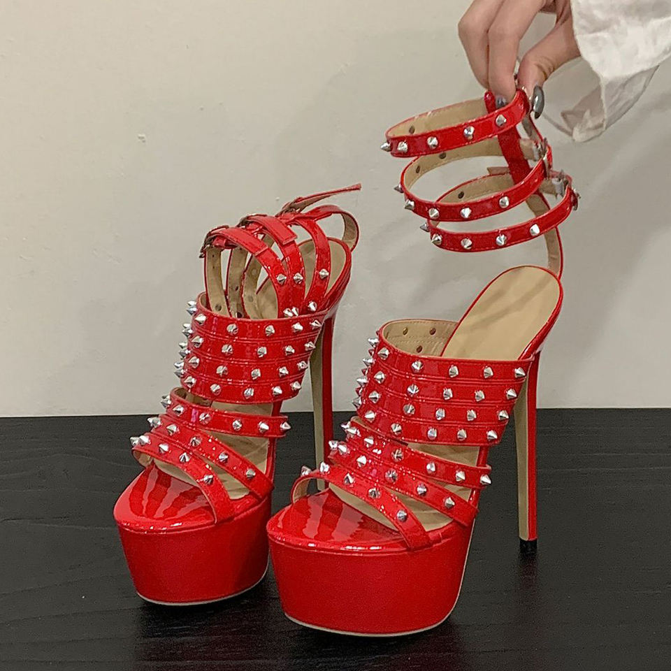Scarpe da Donna Sexy con Borchie Metalliche, Tacchi Alti Estremamente Sottili, Sandali con Plateau Spesso e Punta Aperta, Scarpe da Ballo con Cinturini alla Caviglia