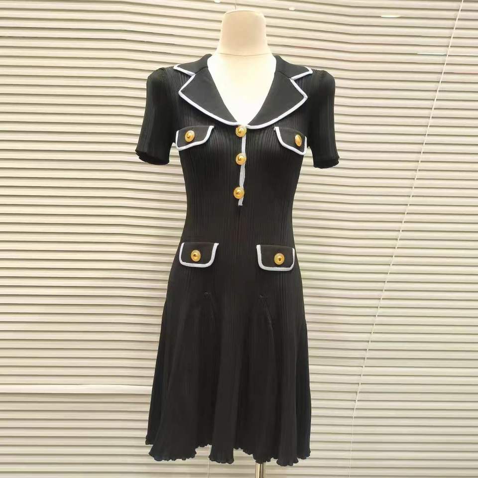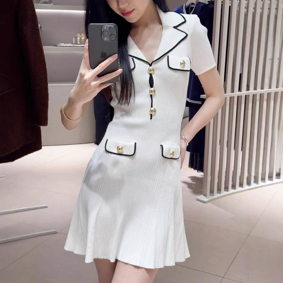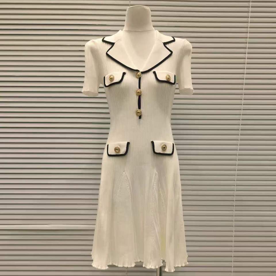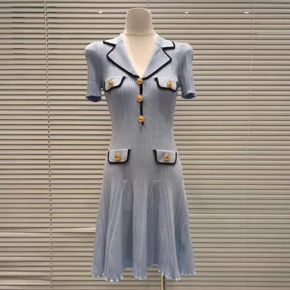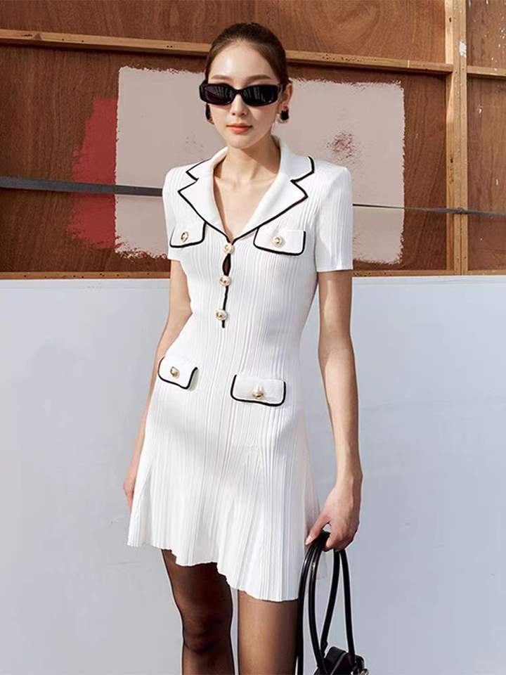 Mini abito da donna a maniche corte lavorato a maglia bianco o blu a vita alta primavera donna bottoni con colletto rovesciato abiti a trapezio
