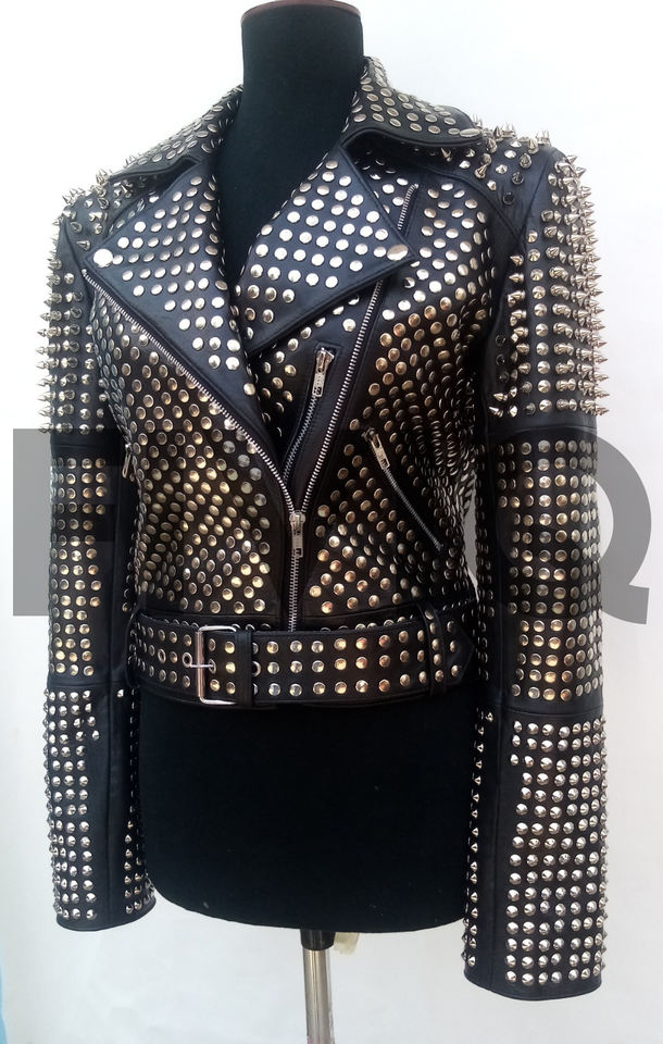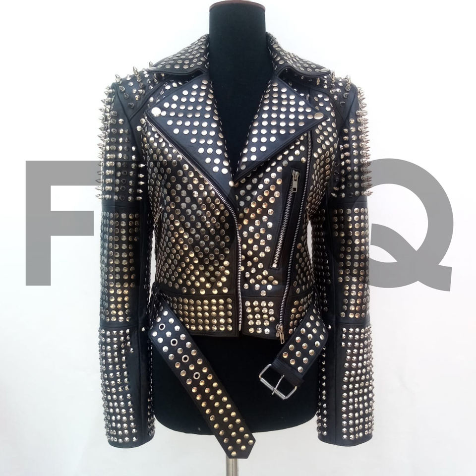 Women Silver Studded Spiked Jacket Black Rock Punk Style Jackets Custom Rock Style Biker Heavy Studded Leather Jacket