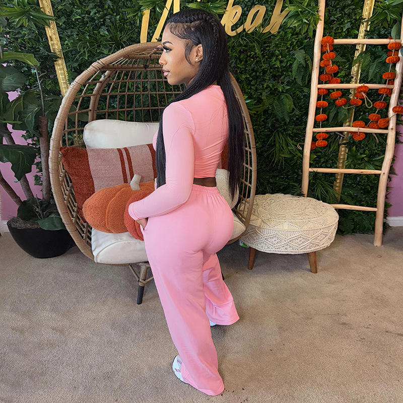 Women Solid O Neck T-shirt with Pants Set Two Pieces Casual Wide Leg Pants Suit Long Sleeve Crop Top Set Autumn Tracksuits
