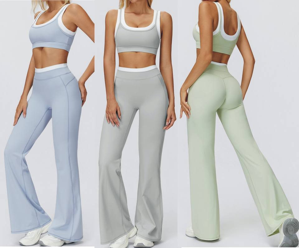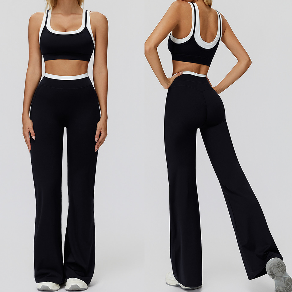 Women Sports Underwear Bra + Flare Pant 2 Piece Set Loose Wide Leg Legging White Base Line tank Top Gym Club Uniform Yoga Sets