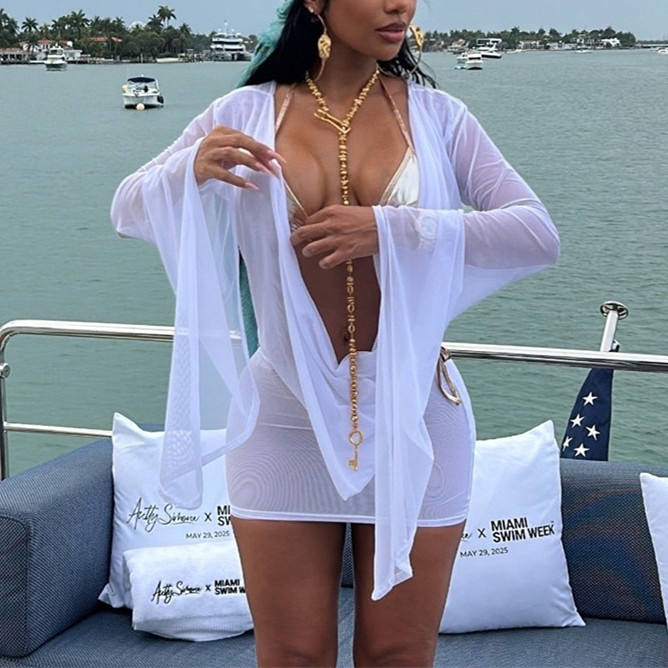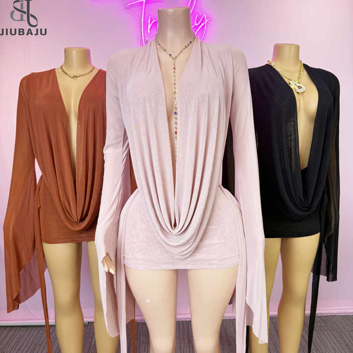 Abito da donna aderente con colletto oscillante trasparente in Mesh Mini svasato manica lunga con nastro di pizzo senza schienale abito da vacanza