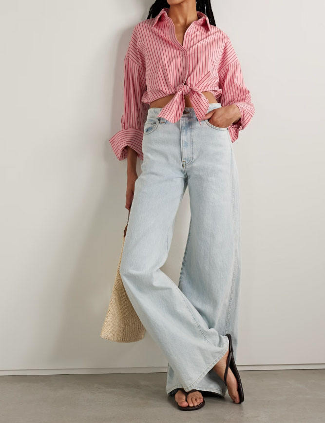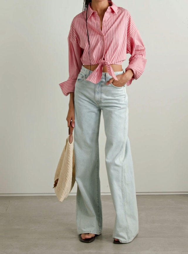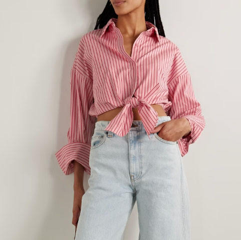Women Tie Front Cropped Shirt Striped Cotton Blend Poplin Top Shirt
