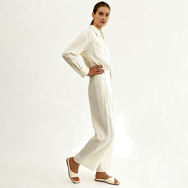 Completo da donna due pezzi, camicia a maniche lunghe, pantaloni a vita alta a gamba larga, elegante completo bianco, moda estiva casual, set coordinato da donna