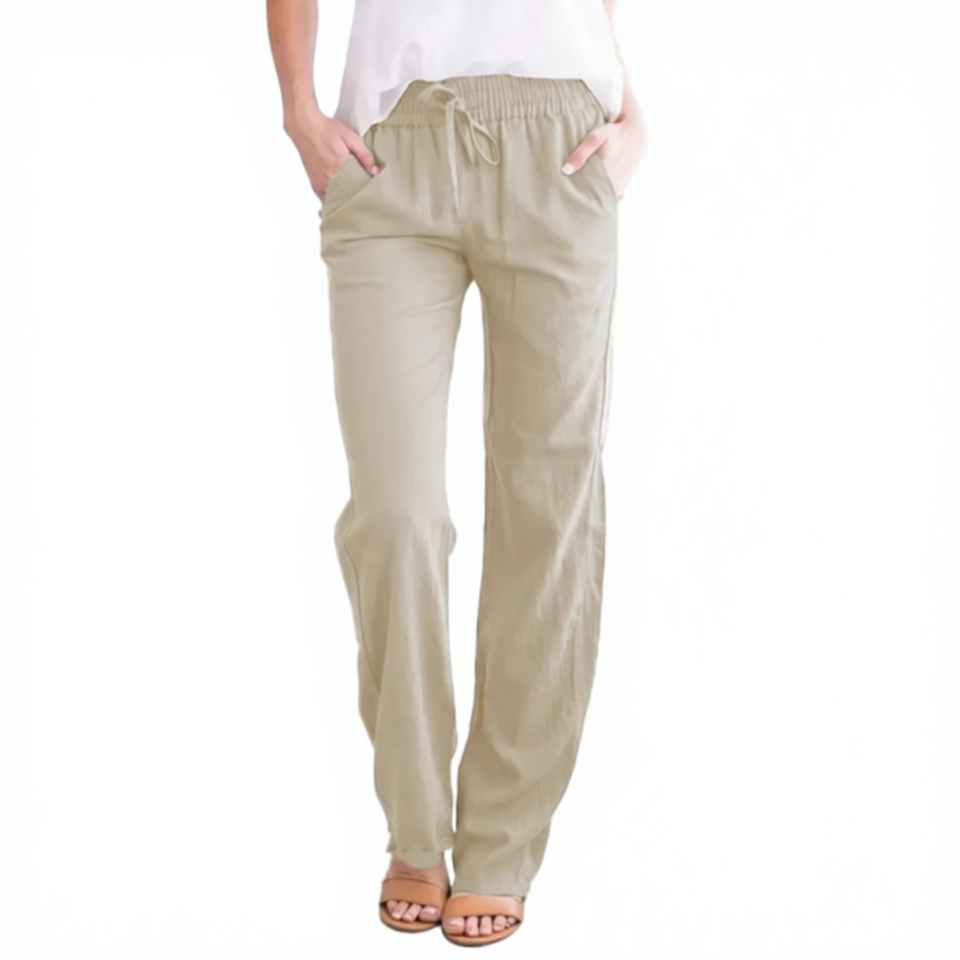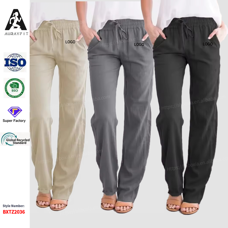Pantaloni Vintage da Donna in Cotone e Lino con Coulisse, Vita Elastica, Tinta Unita, Casual, Larghi, Gamba Dritta, Traspiranti