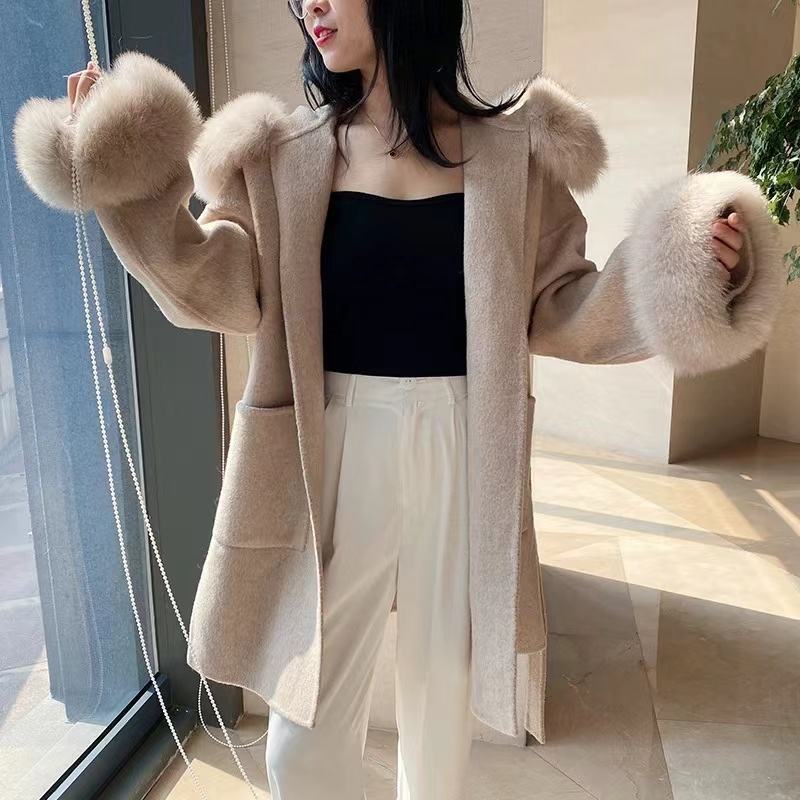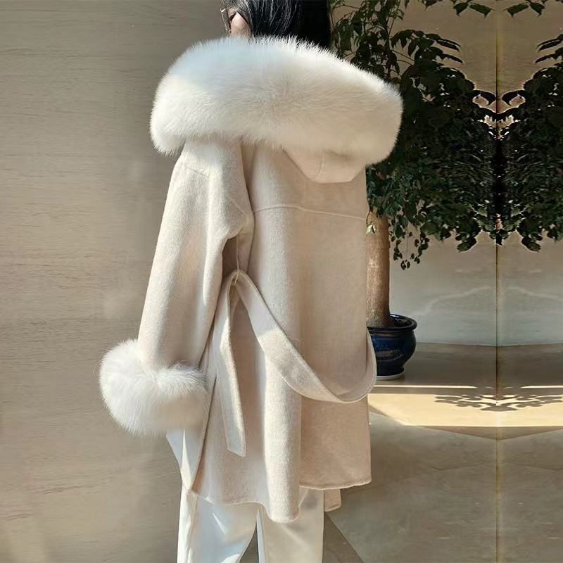 HIGH STREET Cappotto donna in cashmere-lana, collo e polsini staccabili in pelliccia di volpe, cappuccio, 100% poliestere, 2.0kg