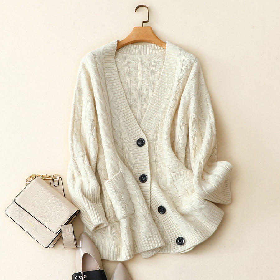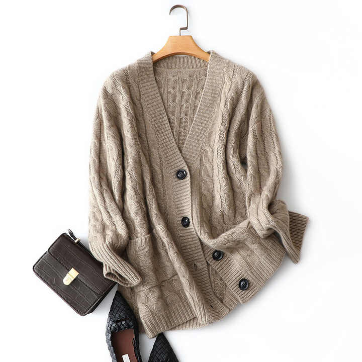 1 pezzo di maglia a coste in misto lana Beige scollo a V manica lunga Cardigan maglione con tasche