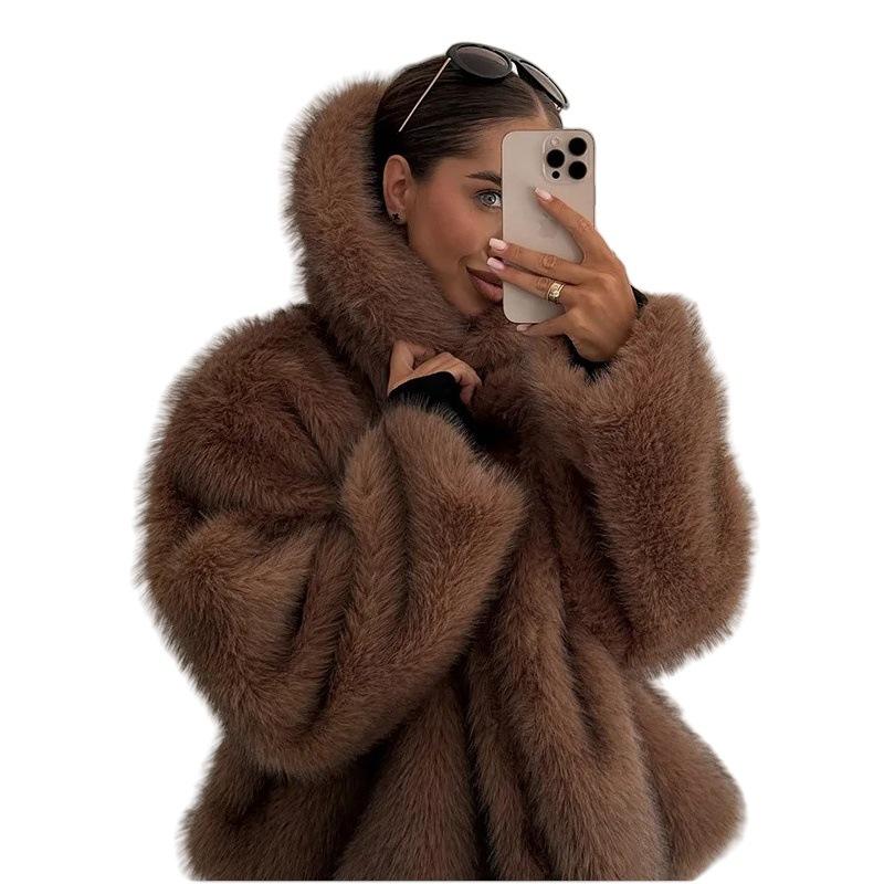 Women's 2025 Autumn Winter Large Lapel Rabbit Faux Fur Trench Coat - Long Woven Warm Commuter Jacket