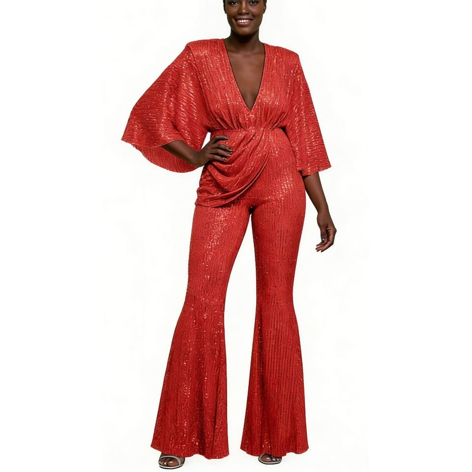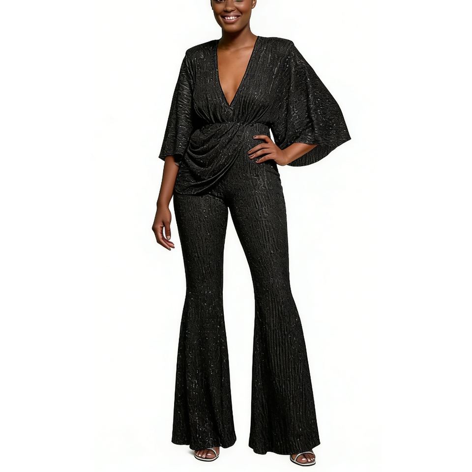 Women's 3/4 Sleeve Sequin Jumpsuit - V-Neck Batwing Sleeve Wide-Leg Party Co-ord Sehe Fashion