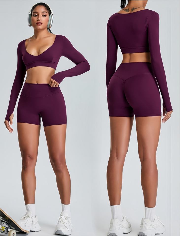 Women's Active Fitness Gym Wear Set Long Sleeves Crop Top & Bike Shorts Solid Pattern Sexy Cycling & Pilates Yoga Suit Plus Size