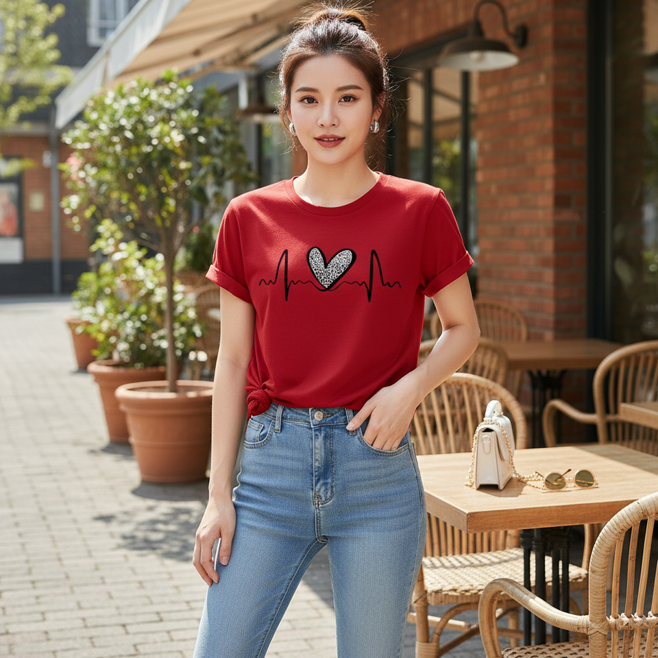 T-shirt basic da donna a girocollo a maniche corte con stampa Heartbeat in poliestere, primavera estate, casual, per tutti i giorni, non trasparente