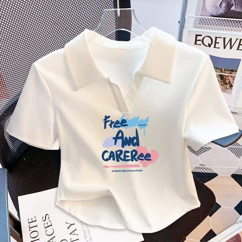 T-shirt Crop Top Basic da Donna con Colletto a Polo, in Cotone Elasticizzato, Manica Corta, Vestibilità Slim