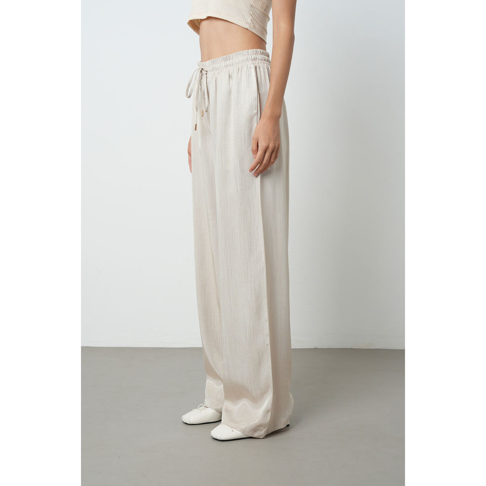 Women's Beige Wide Leg Trousers with Elastic Waist Featuring Fine Patterned Design