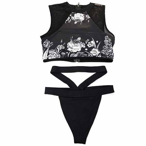 Women's Black Floral Bikini in XS Size High Waist Beachwear Breathable Bamboo Fabric Swimwear Featuring Fruit Pattern Logo Waist